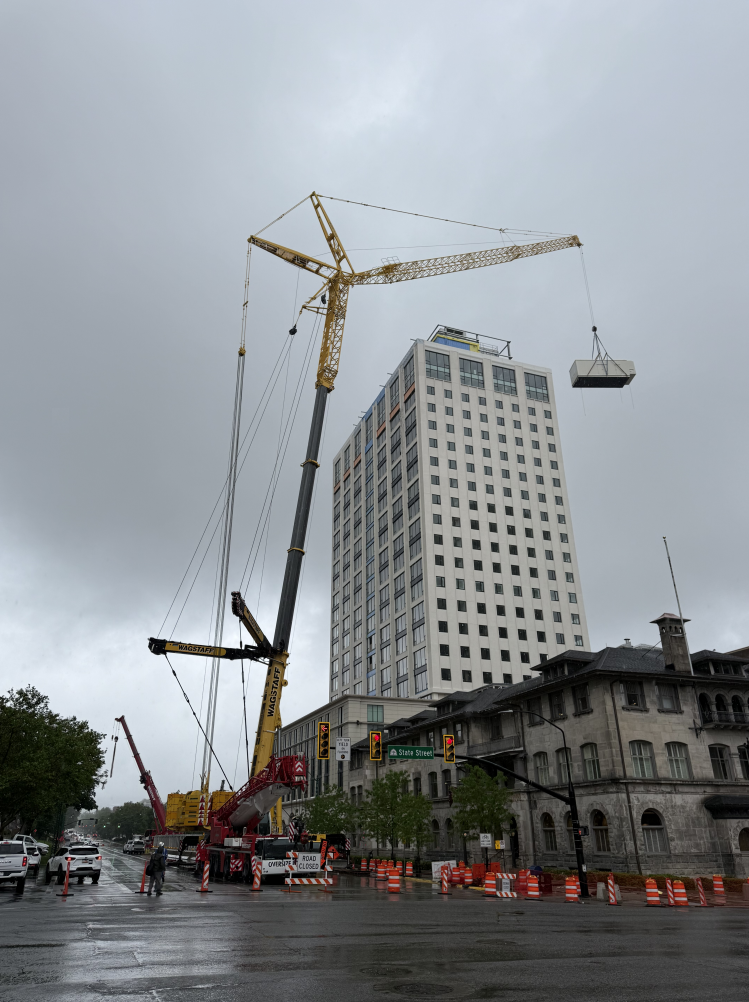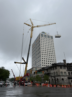 The lift had some challenges, tight time windows, road closures, limited set up room, and exact load placement.